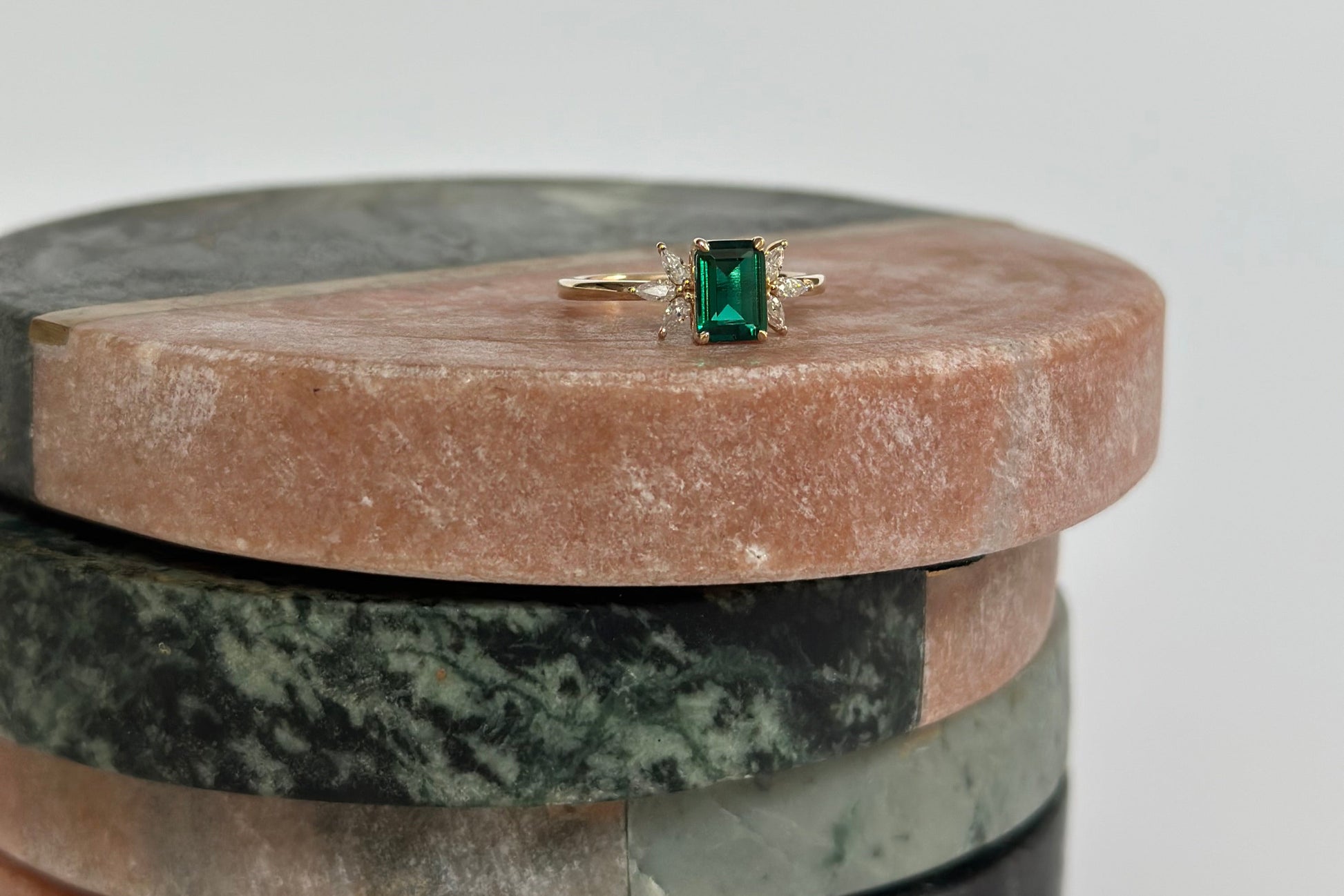 • Centre stone: 5x7mm lab-grown emerald
